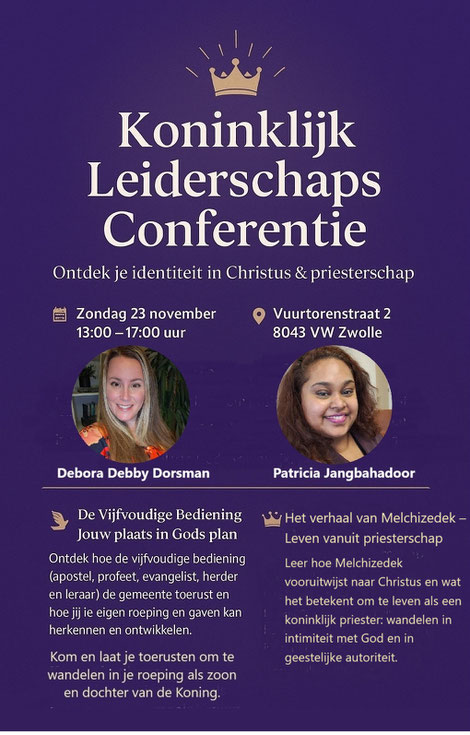 Leiderschap gaat niet alleen om positie, maar om identiteit. Tijdens deze conferentie ontvang je sleutels om te groeien in wie je bent in Christus en om te wandelen in je roeping als deel van Gods Koninkrijk.